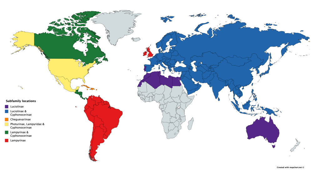 Fireflies have been found on every continent except Antarctica, as seen in the map below, showing where each subfamily is present.